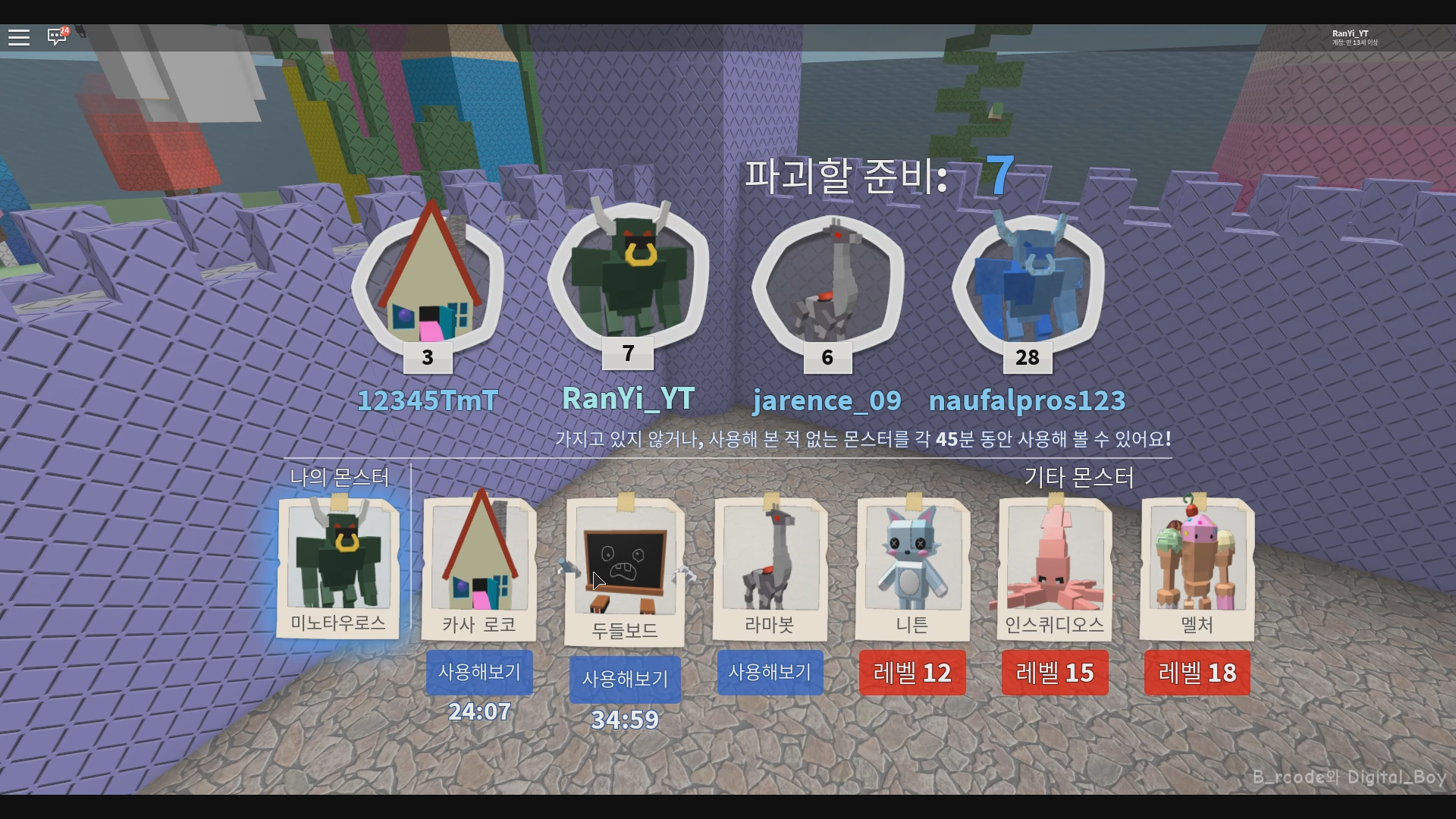 게임 플레이를 하시다 보면 내가 몬스터로 진행이 가능합니다. 아래 레벨을 충족해야 더 멋진 몬스터들도 플레이를 할 수가 있는데, 레벨을 만족했다고 무조건 할 수 있는게 절대 아니라 게임을 플레이하면서 얻은 골드로 구입을 하셔야 합니다. 무료로 사용해보기가 있으니 무작정 구입하지 마시고 자신에게 맞는 몬스터를 구매하시면 좋을 것 같습니다. 저는 처음에 받는 미노타우르스가 마음에 들어서 게속 가지고 있고 나중에 오징어, 아이스크림괴물도 한번 해보고 싶네요.