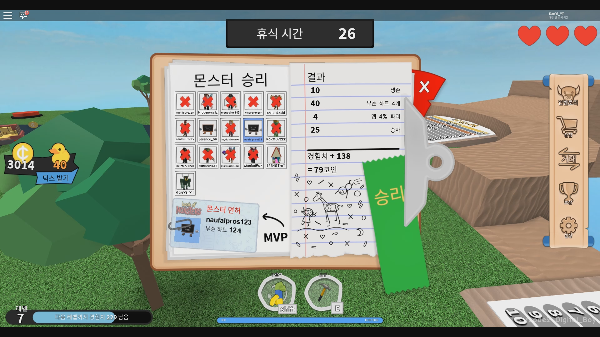 특별하게 한게 없지만 몬스터 승리로 게임이 끝났습니다. 그리고 138의 경험치, 79코인을 얻었네요. 위를 보니깐 맵을 많이 파괴해도 골드를 많이 주고 하트 하나당 10원씩 골드를 주니깐 적을 못잡겠다고 생각하시는 분들은 맵을 파괴하면서 플레이를 하는 방법 역시 돈을 빨리 모으는 수단 중 하나인 것 같아요.