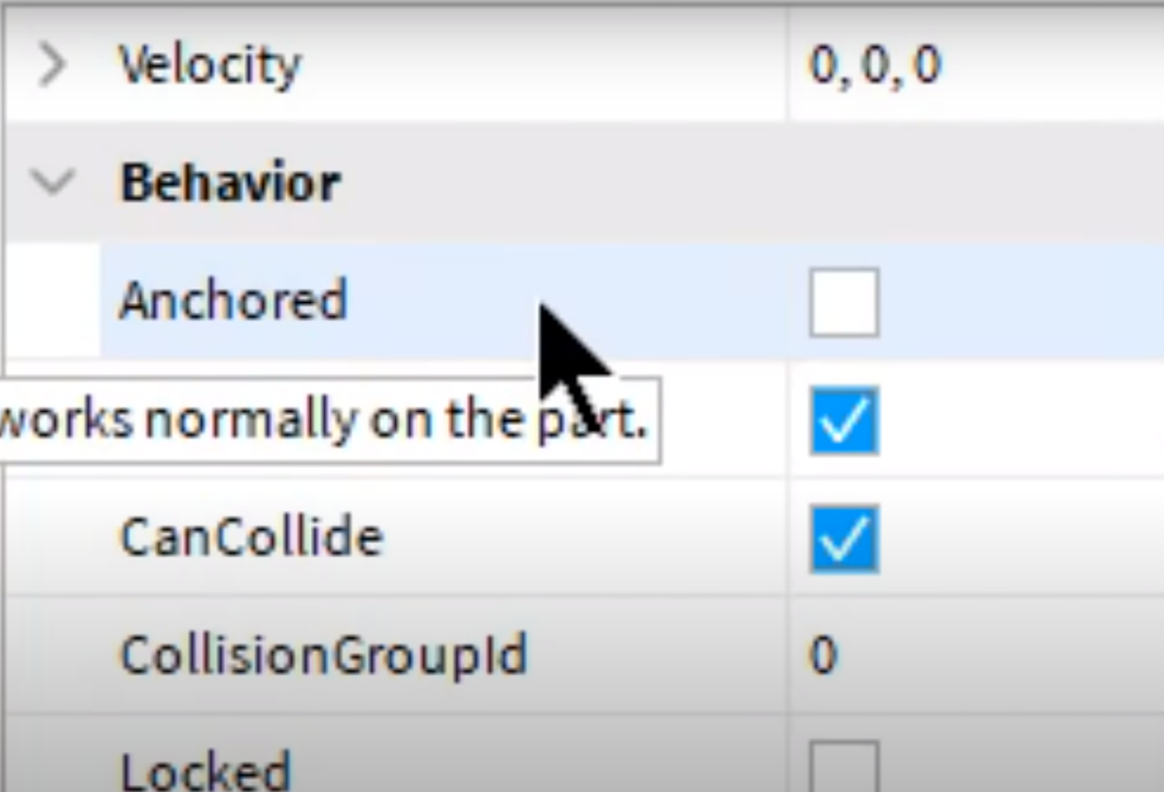 블록들이 사라지거나 없어지는 경우에는 Anchored 이게 체크가 되어 있는지 꼭 확인을 하셔야 합니다. 이 기능에 대해서 설명을 해드리면 블록을 고정하는 기능인데요, 저게 체크표시가 되어 있지 않은 블록들은 아래로 떨어지거나, 여러분들이 가까이 가면 블록들이 밀리게 됩니다. 그래서 모든 블록들이 저 표시가 되어 있어야 단단하게 고정됩니다. 간혹 실수를 하는 부분이 있는데, 여러분들이 처음에는 블록을 고정시켜놓고 다음 점프맵을 만들 때 part 부분에서 새로운 블록을 꺼내왔는데 그 블록은 Anchored를 체크 해주지 않아서 자꾸 떨어지는 경우입니다.