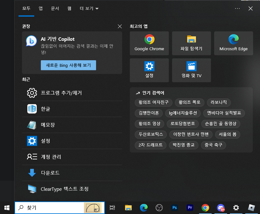윈도우 검색창에 프로그램 추가/제거를 입력합니다.